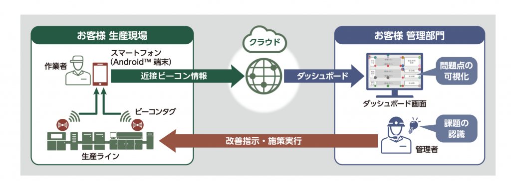 本サービスは、製造ラインや倉庫内に設置したビーコンと、作業員や台車に取りつけたスマートフォンの通信により、人の動きをモニタリングし、データとして見える化することにより、工程の遅延やライン停止が発生しやすい場所や人を特定し、改善につなげることが可能となります。