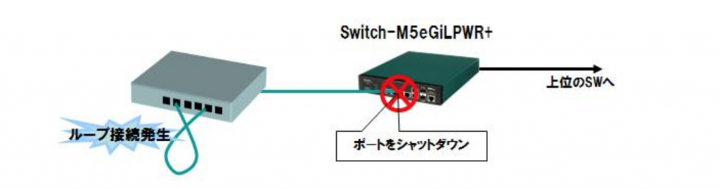 本製品は、スイッチ配下でループ接続が起きると、該当するポートをLEDで知らせるとともに、そのポートのみシャットダウンする「ループ検知・遮断機能」を搭載しています。ループ障害を最小限に抑え、現場対応の迅速化を図ることができます。