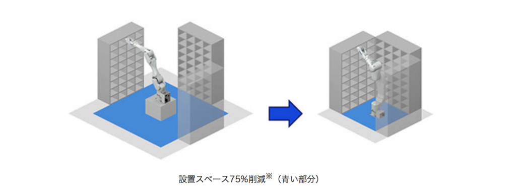 発売中の「N2」に続く新モデル『N6』は、可搬重量を6kg、アーム長を1000mmへとロングアーム化しました。1000mmアーム長ながら、当社6軸ロボットの「C8XL(1400mmアーム長)」と同等の高さへアクセスできるとともに、棚との距離を詰めてロボット装置を設置できることから、設置スペースを約75%削減(※)することができます。