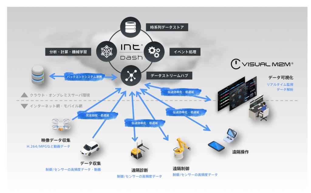 「intdash」は、自動車、産業機器、ロボットなどがコネクテッド化する際にやり取りされる短周期かつ膨大な制御・センサーデータを、通常のモバイル・インターネット網を介して、リアルタイムに、確実に、双方向に伝送・収集することができる高速IoTハブフレームワークです。