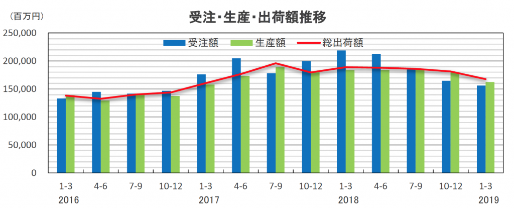 受注額は1560億円で前年同期比28.7%減、生産額も二桁減少となり、前年同期が17年比で受注額24.2%増と大幅増加だったことを考慮しても、18年下期から続く鈍化傾向がより鮮明となっていることがわかった。