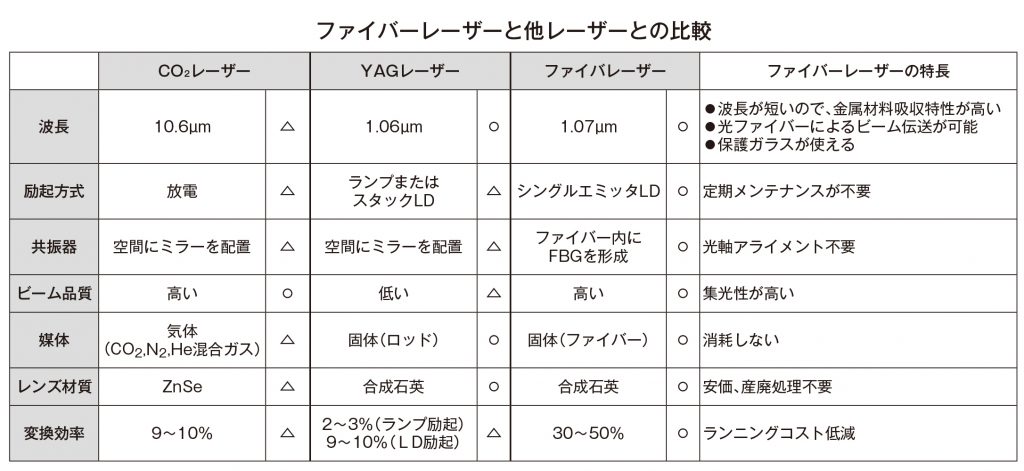 CO2レーザーやYAGレーザーに比べてファイバーレーザーの一番のメリットは、高出力レーザーを小型かつ高効率で発生できることだ。