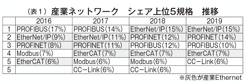 ネットワークごとのシェア(図1)は、産業EthernetベースのEthernet/IPとPROFINETが年々シェアを拡大し、18年にPROFIBUSを抑えて、シェアトップと2位に位置している。