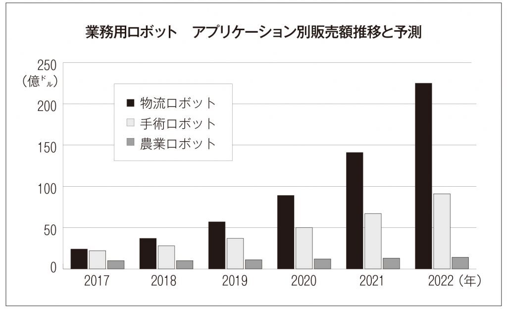 AGVなど物流ロボットと、検査・メンテナンス用ロボットが中心の業務用サービスロボットは、18年は27万1000台を販売し、販売額は前年比32%増の92億ドルとなった。こちらも強い拡大傾向で、19年には33%増の36万1000台、37%増の126億ドルになり、22年には100万台、380億ドルになると見られている。