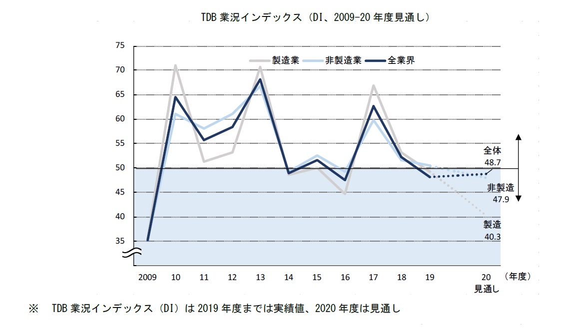 改善・悪化を指数化したTDB業況インデックスでは、19年8月時点から0.6ポイント回復して48.7となると予想。総じて前向き傾向だが、製造業は40.3で19年の49.2から大幅に悪化している。