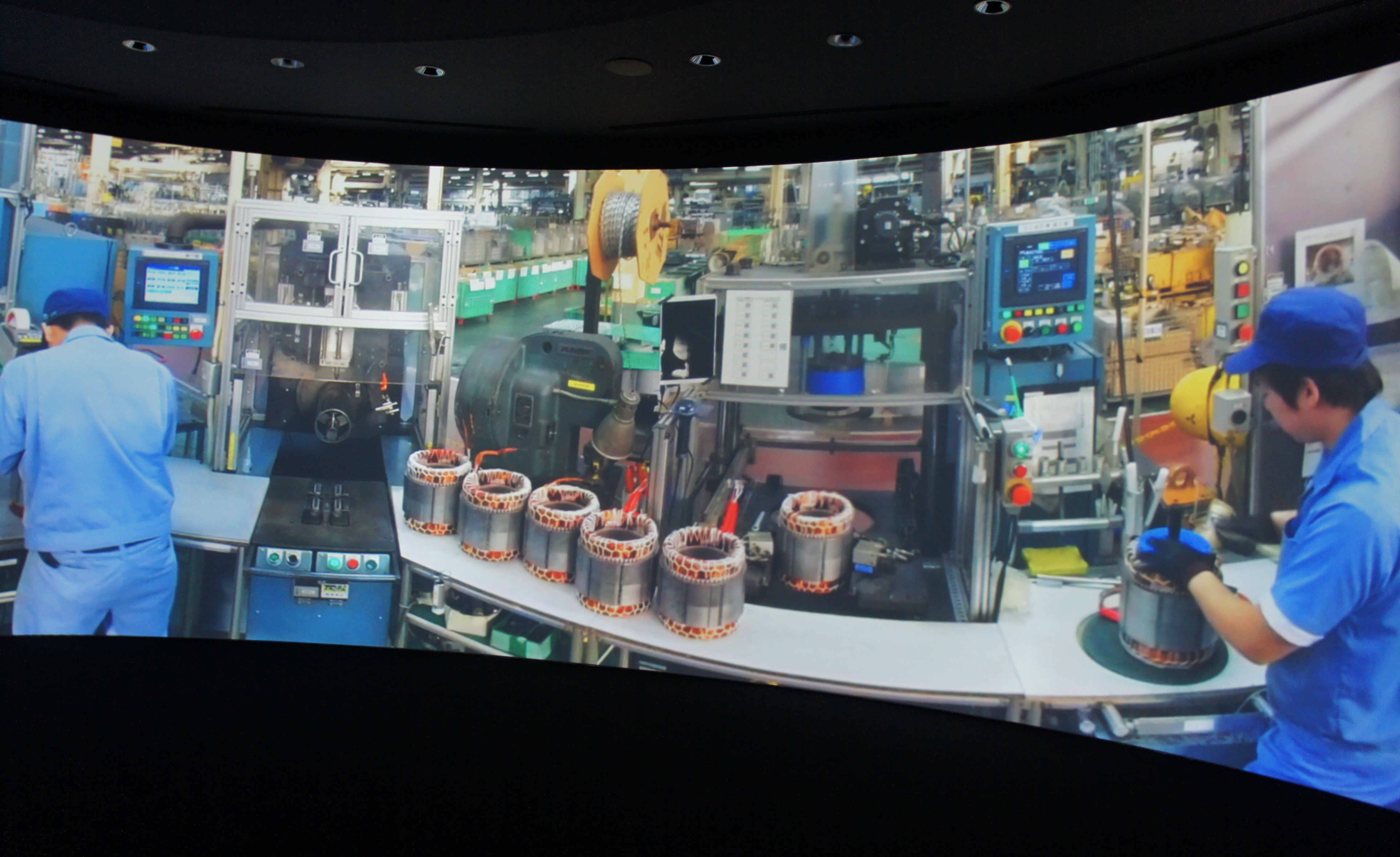 はじめは「ウェルカムゾーン」。e-F@ctoryで目指すスマートファクトリーの未来と、いま多くの現場で求められている機能やソリューションを紹介する映像コンテンツが、180度の巨大スクリーンに映し出され、FA・自動化の現在地と将来の姿、トレンドを学ぶことができる(約10分)。
