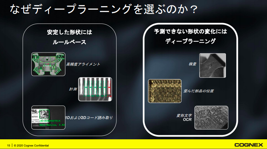 ルールベースは、高精度アライメントや計測、コード読取りなどルールが決めやすいもの、安定した形状の識別を得意としている。一方、ディープラーニングの場合、検査や歪んだ部品の位置計測、変形した文字のOCRなど予測できない形状の変化の識別を得意とする。ルールベースでは想像しきれていない問題や、まだ発生していない事象に対しても、学習を通じてロジックを自動で作成して用意し、いざ問題が起きた時に対応できる。検査工程で人が目視して脳で判断しているプロセスに近いことを行い、さらにコンピュータをベースとして人よりも正確にできるのがディープラーニングで、これまで以上に正確なGIGIができるようになる。