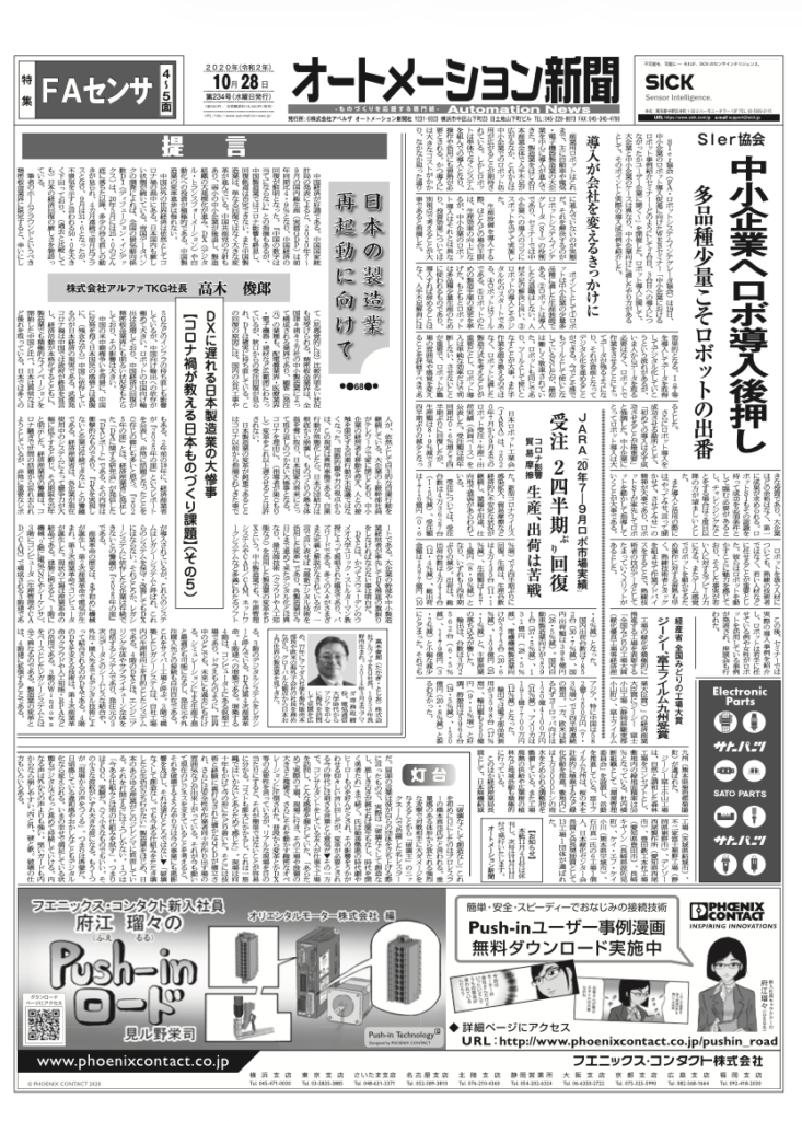【オートメーション新聞No.234】SIer協会「中小企業向けロボット導入セミナー」開催 / ロボット受注、第2四半期は回復基調へ / 安川電機「新型パレタイジングロボ」 / 特集:FAセンサ(2020年10月28日発行)