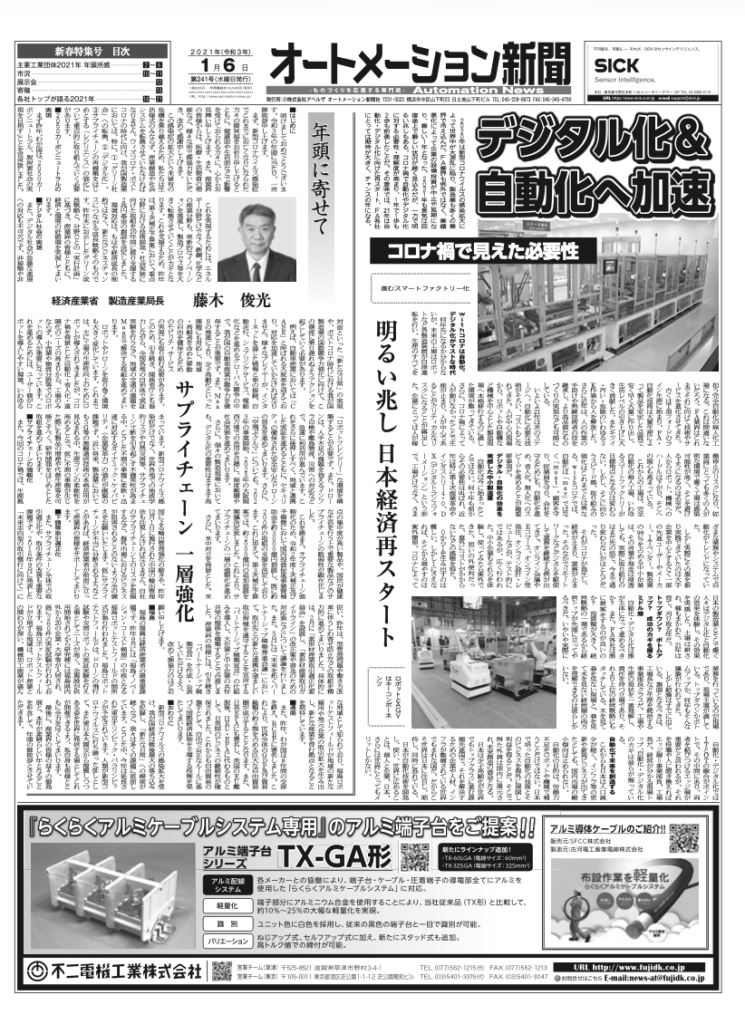 【オートメーション新聞 第241号】デジタル化&自動化へ加速:コロナ禍で顕在化した「マスト」な変革 / 経済産業省 藤木俊光局長年頭所感 / 2020年度機械工業生産は前年度比13.1%減の63兆円見通し(2021年1月6日発行)