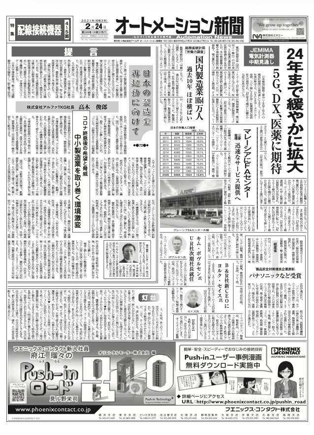 【オートメーション新聞 No.246】配線接続機器、回復急ピッチ:5G・DX・医薬需要が牽引 / 三菱電機 マレーシアにFAセンター開設 / 日本の製造業再起動へ(2021年2月24日発行)