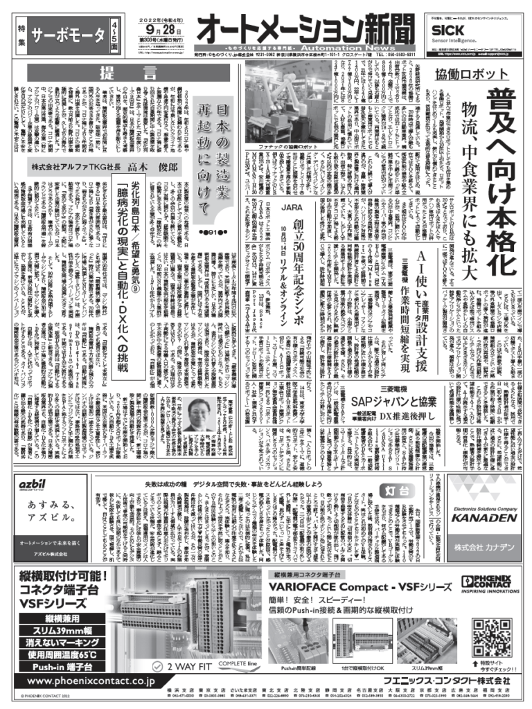 オートメーション新聞は、2022年9月28日号を発行しました。今週号では、普及が進む協働ロボットの状況と、半導体製造装置やロボット、工作機械をはじめとする各種生産装置や自動化設備の高性能化の鍵を握るサーボモータを特集しています。