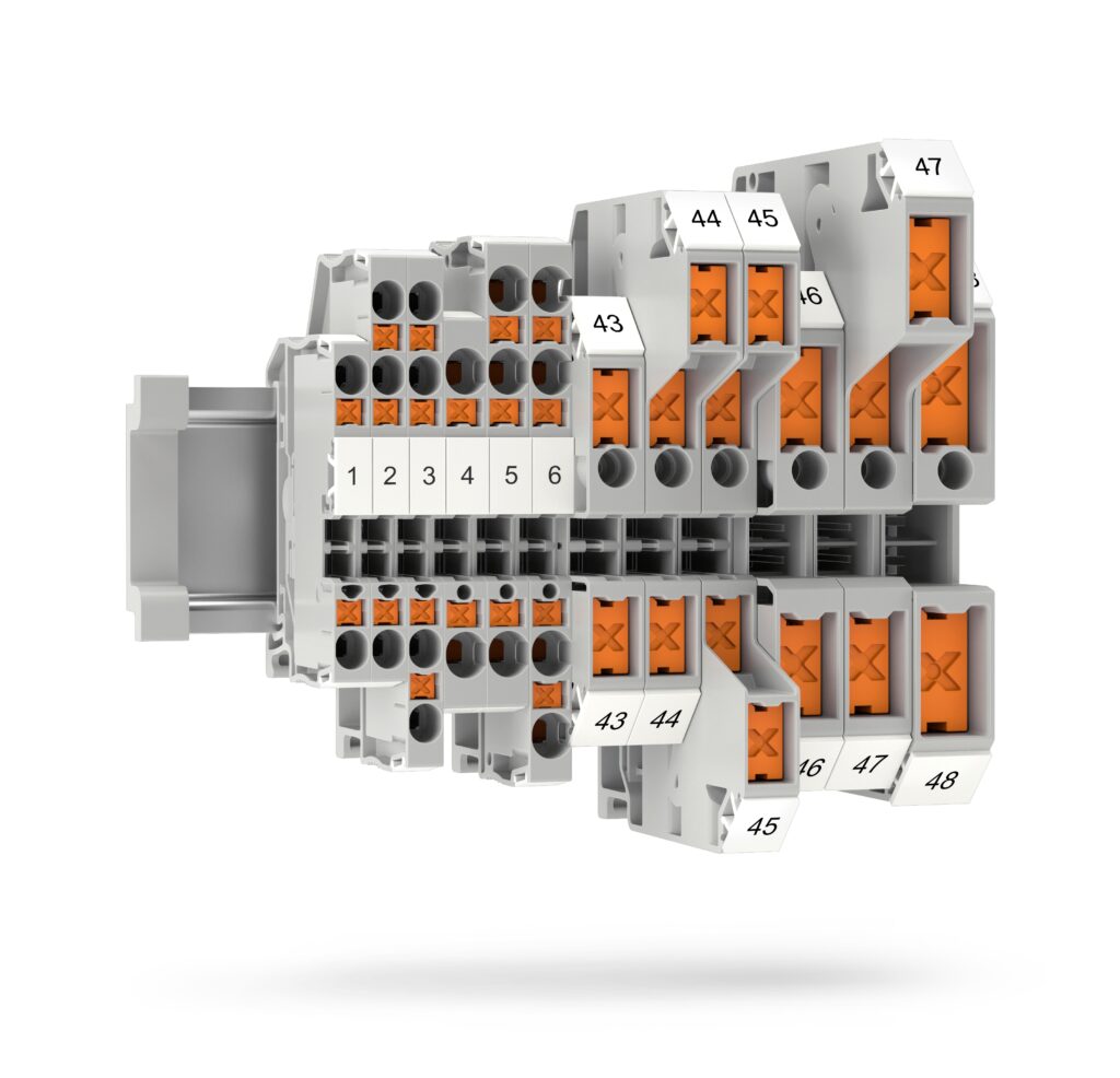 側面接続のXTVシリーズと上面接続のXTシリーズで、0・5~16㎟まで広い電線径をカバーする。また、従来のPush-in式PT端子台やスプリング式ST端子台とも、ブリッジバーやマーキングなどのアクセサリは共用可能である。