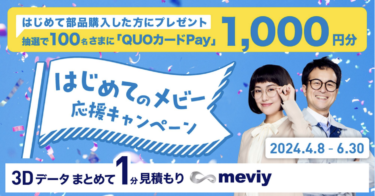 ミスミは、機械部品調達 AI プラットフォーム「meviy(メビー)」について、「はじめてのメビー応援キャンペーン」を実施している。期間中、meviyで初回購入した人を対象に、抽選で100人にQUO カード Pay1,000 円分をプレゼントしている。期間は6月30日まで