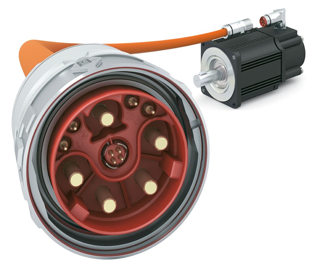 また、電源/信号/通信を1つのコネクタ内で接続することで省配線化を図ることができるM40/23サイズのハイブリッドコネクタや、小型機器向けの電源用M12コネクタ(K/L/Mコード)など、新しいコンセプトのモータ設計に幅広く対応している。