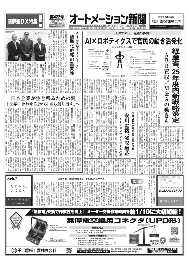 【オートメーション新聞No.422】 日本ロボット産業の再興へ / インタビュー 三菱電機 ブレーカ端子カバー型電力計測ユニット / GEA発足記念トークセッション / 制御盤DX特集 など(2025年10月15日)