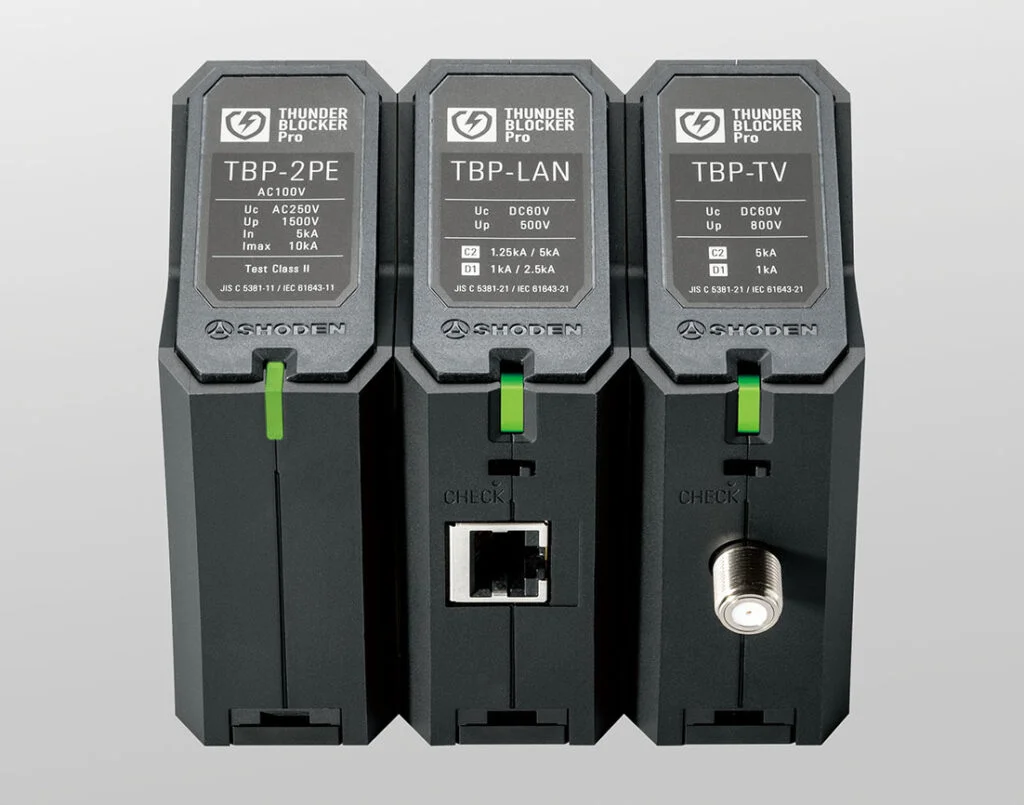 昭電「サンダーブロッカーPro」は、業務用機器からパソコン、テレビなどの各種機器を雷から保護するSPD(サージ保護デバイス)で、3タイプが完備。サンダーブロッカーProを雷から保護する機器のケーブルに接続するだけで取付配線が完了するため、電気工事の資格を必要とせず誰でも簡単に機器の雷害対策が可能。