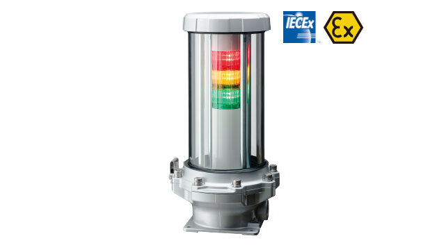 同製品は、防爆エリアでの安全性と信頼性を実現する防爆構造の積層信号灯・表示灯で、ATEX規格(Ⅱ 2 G Ex db ⅡB+H₂ T6 Gb)とIECEx規格(Ex db ⅡB+H₂ T6 Gb)に適応した耐圧防爆構造を採用。グローブは硬質透明ガラス、ボディはアルミダイカストで、美しい地肌に、塗装処理を施している。ガス設備、塗装ライン、発電所、化学プラント、鉄鋼プラントなど、引火爆発の危険がある場所での、警告用に使うことができる。