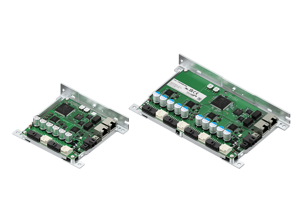 今回新たに追加された2軸ドライバにより、XYステージやコンベヤなど、軸数が少ない装置構成においても無駄なくスペースに合わせた柔軟なレイアウトが可能となった。また、ドライバ本体はEtherCAT通信ケーブルによるデイジーチェーン接続に対応しており、配線を大幅に削減できるほか、エンコーダ情報の取り込みや電磁ブレーキの自動制御機能も搭載しているため、上位コントローラの負荷軽減や開発工数の削減にも寄与する。