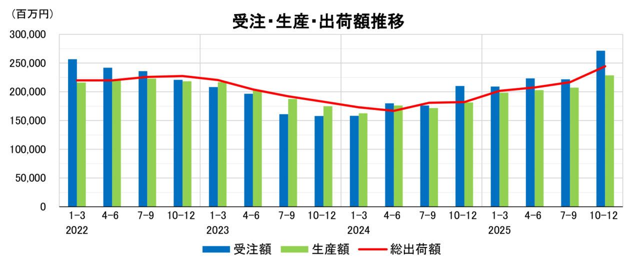 2025年の受注額は前年比27.8%増の9258億円、受注台数は19.1%増の19万7738台。生産額は21.0%増の8373億円、生産台数は17.2%増の18万9500台。出荷額は23.8%増の8708億円、出荷台数は22.7%増の5万1821台と、いずれも大幅な増加。年間を通じて前年を上回る好調さを維持した。