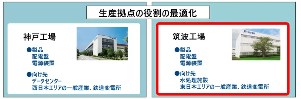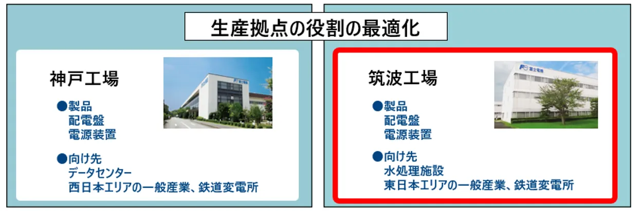 同時に、神戸工場と筑波工場における生産拠点の役割を最適化し、神戸工場ではデータセンター、一般産業(工場、商業施設など)、鉄道変電所向け、筑波工場では一般産業、鉄道変電所、水処理施設向けの配電盤や電源装置を生産し、両工場で生産する一般産業、鉄道変電所向けについては、納入先に応じて生産拠点を振り分けていく。