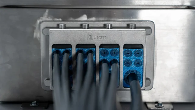 圧縮機構を内蔵した耐酸性ステンレス製フレームと、ケーブル外径に合わせて調整可能な「Multidiameter」モジュールで構成され、迅速かつ容易に施工できる。面積効率に優れ、1つの開口部に最大16本または32本のケーブルを通すことができ、コネクタ付きケーブルも端末処理なしで施工可能。将来の増設に備えた予備スペースも確保でき、後から配線を追加する際も新たな穴あけ加工が不要となる。