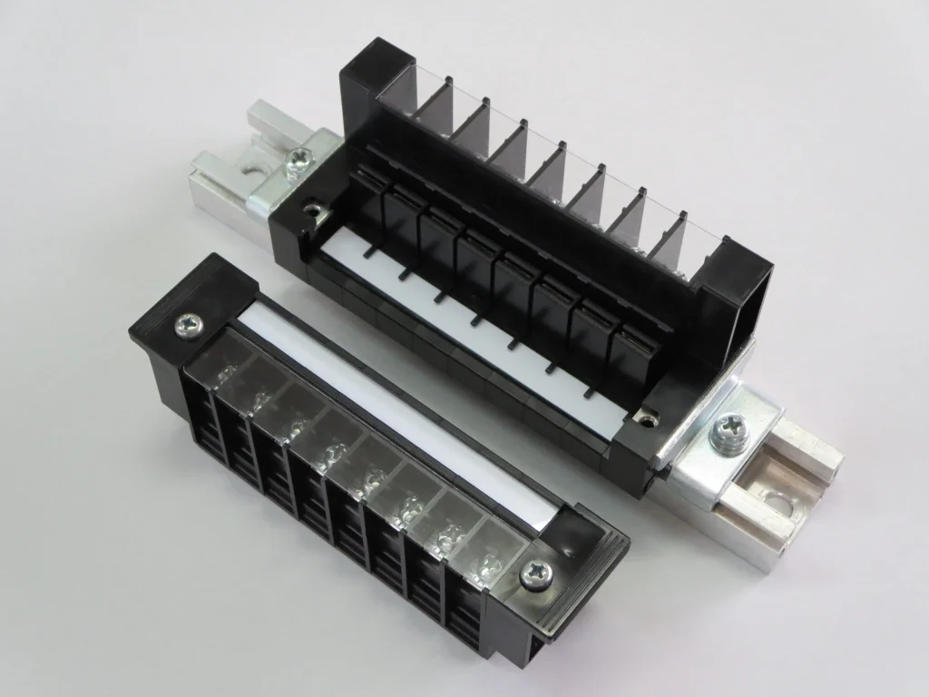 盤間端子台は、電線を接続したままで、端子台の1次側、2次側を分離できるもので、盤間の配線作業時間を短縮でき、設置する場所で配線作業時において、誤配線を心配する必要がない。配電盤間や制御装置間の配線接続。及び取り外しが容易に行なえ、端子ねじはバネアップ式のため、配線作業性も良い。