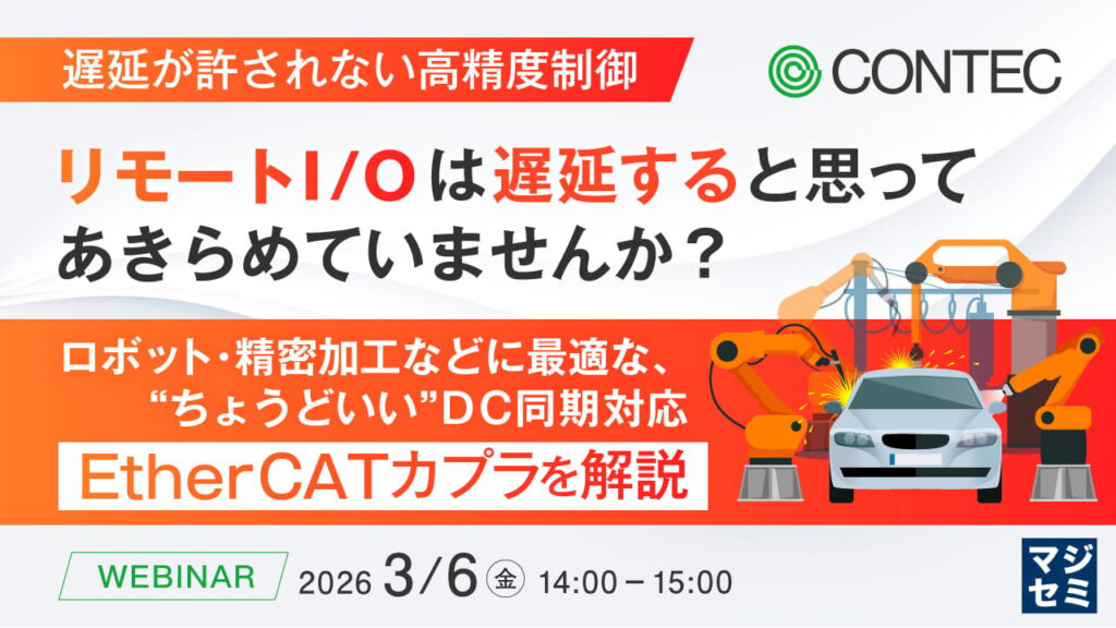 コンテックは、3月6日に、高精度の同期制御をテーマにした無料ウェビナー「リモートI/Oは遅延すると思ってあきらめていませんか?~ロボット・精密加工などに最適な、“ちょうどいい”DC同期対応EtherCATカプラを解説~」を開催する。