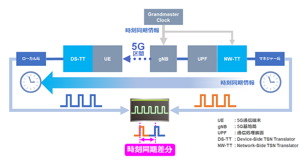 通信のリアルタイム性につながる時刻同期精度の計測として、「TSN over 5G」で用いられる時刻同期プロトコルのgPTPに基づき、情報を送信するネットワーク側機器と情報を受け取り処理する端末側機器との間で生じる時刻差を評価した結果、無線通信規格の3GPP Rel.16で要求される時刻同期精度900ナノ秒以下を大きく上回る、平均122ナノ秒の高精度な時刻同期を実現。