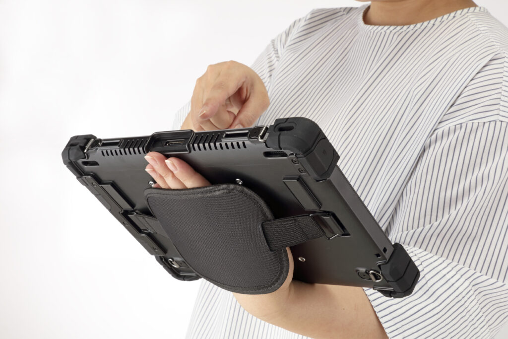 専用のマルチジャケットを装着することで防塵・防水規格IP43に準拠し、工場や倉庫などの埃や水滴が気になる環境下でも安心して利用できる。また、ハンドホルダーやショルダーベルト、VESA対応金具などの豊富なオプションを用意。検品作業や受付端末、壁掛け設置など、現場のニーズに合わせて柔軟な使い方が可能だ。