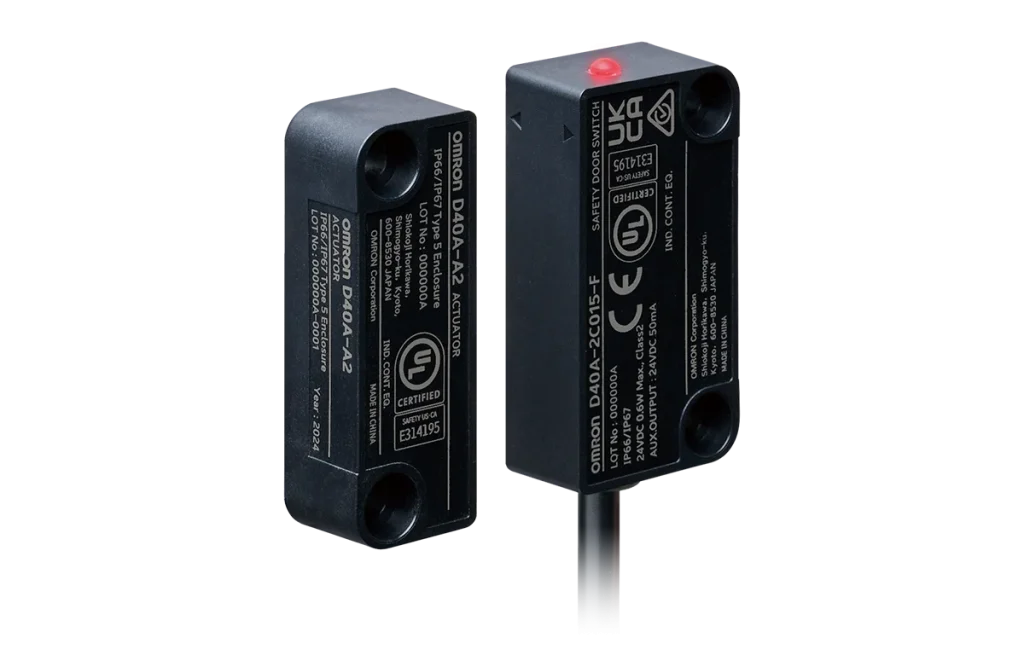 オムロンの非接触式セーフティドアスイッチ「D40A-2」は、PLe/カテゴリ4の安全性と耐環境性、優れたコストパフォーマンスを両立したセーフティスイッチ。