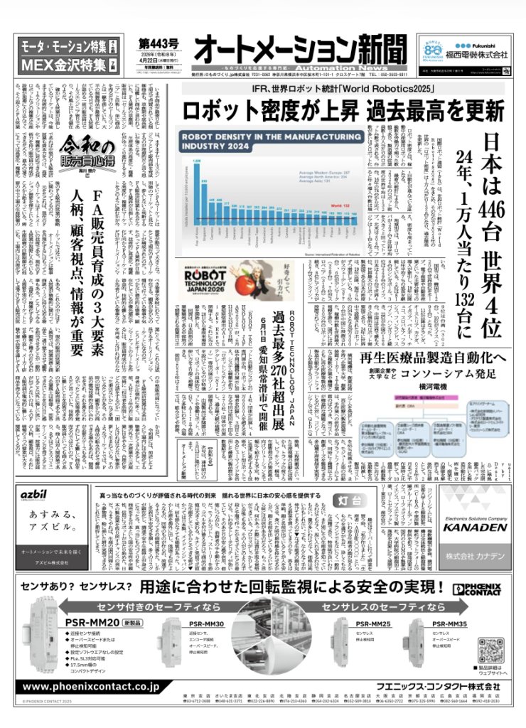 【オートメーション新聞No.443】IFR「世界ロボット統計」ロボット密度が過去最高を更新 / 横河電機ら「再生医療品製造自動化」コンソーシアム発足 / オプテックス・エフエー「ZA-Bシリーズ」業界初リニアリティ保証 / モータ・モーション特集 / MEX金沢2026特集(2026年4月22日発行)