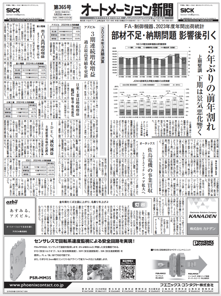 お知らせ 2024年5月21日 【オートメーション新聞No.365】FA・制御機器2023年度出荷統計/【制御盤DX】ナカサク、電気CAD更新で設計効率化/2023年度決算アズビル、富士電機、日東工業/しゃぼん玉石けんのスマートファクトリーなど(2024年5月22日)